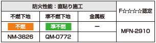 ●建築基準法が規定するF☆☆☆☆認定及び不燃材料の下地材と組み合わせにおいて防火認定を受けております。 ●防火認定は、建築基準法第68条の26第1項に基づき同法第2条九号及び同法施工令108条の2に基づくものです。 ●F☆☆☆☆認定は、建築基準法第68条の26第1項に基づき同法第2条第九号及び同法施工令20条の7第4項に基づくものです。 ●施工については、一般社団法人日本壁装協会のホームページ記載の「防火壁装材量の施工共通仕様」に準拠してください。 ●接着剤、シーラーなどの施工用資材は、一般社団法人日本壁装協会のホームページ記載の「防火壁装施工用接着剤及び 施工用資材登録商品名一覧」のものを使用してください。